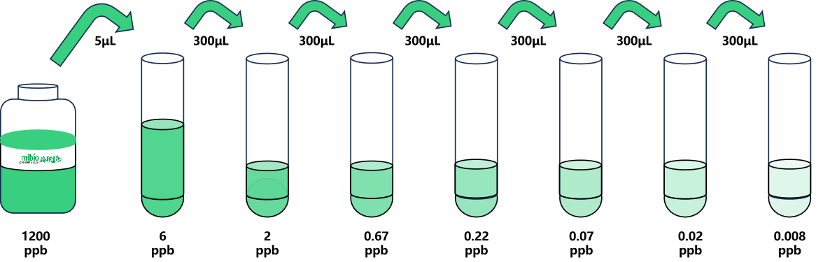試劑盒中取出標準品,準備7個試管,先將1200ppb標準品(200µL)按需吸取一定量用1×稀釋液稀釋至6ppb(例:5µL的標準品母液+995µL的1×稀釋液,制備得到1000μL的6ppb濃度標準品),隨后在6個試管中分別加入600μL的1×稀釋液,在這6個單獨的試管中將6ppb標準品依次3倍倍比稀釋至7個梯度,共配制7個濃度的標準品,依次為:6ppb、2ppb、0.67ppb、0.22ppb、0.07ppb、0.02ppb、0.008ppb,從最高濃度標準品溶液中吸取300μL標準品到下一個試管中,輕輕吹打混勻,以此類推進行標準品的倍比稀釋(如圖所示),1×稀釋液用作零濃度標準品(0ppb)。