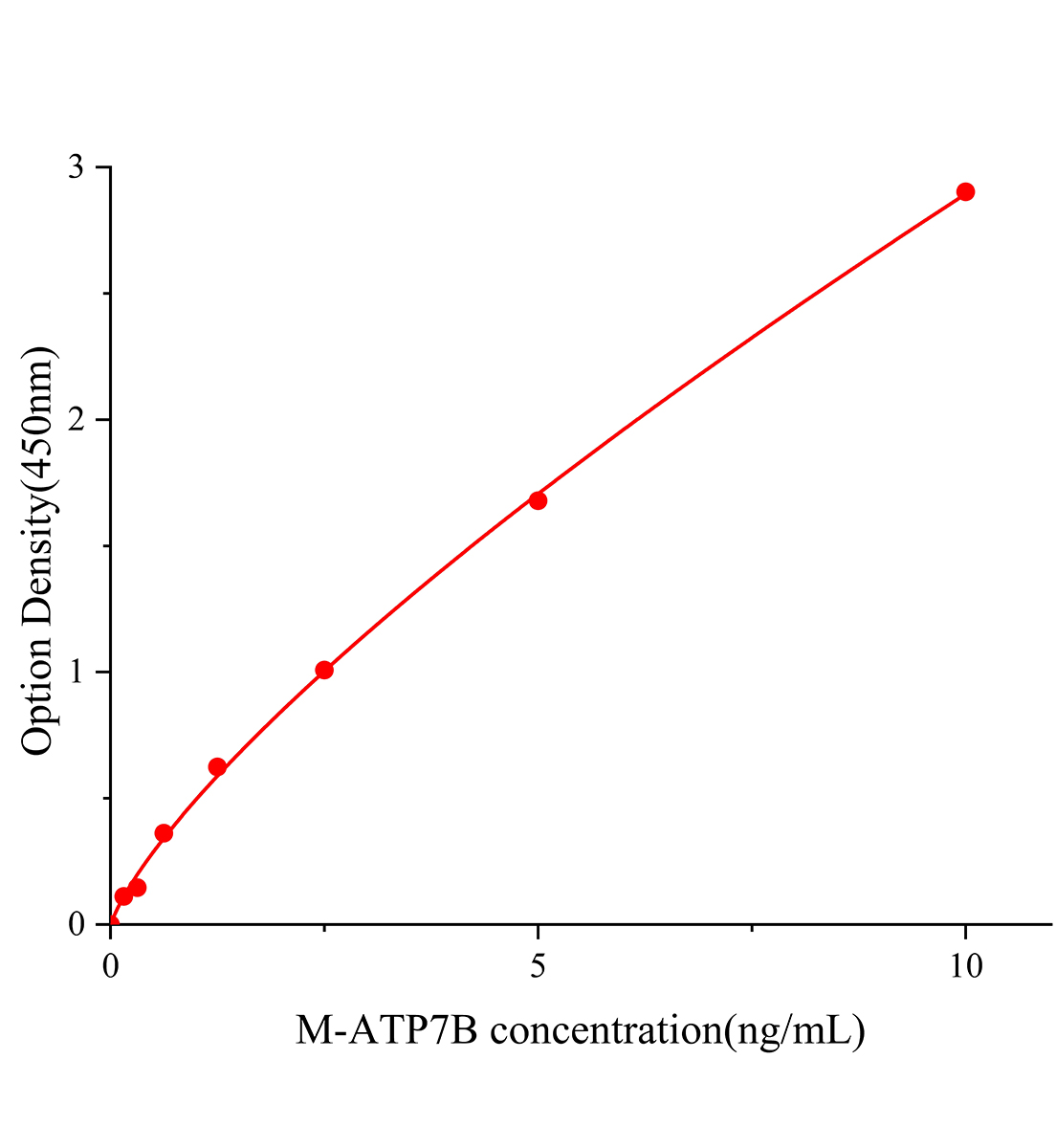 試劑盒采用雙抗體夾心法ELISA技術:將捕獲抗體包被于酶標板上,捕獲樣品及標準品中的待測物ATP7B,孵育清洗后,再加入生物素標記的檢測抗體進行孵育后清洗,形成“捕獲抗體-抗原-檢測抗體”免疫復合物,隨后加入鏈霉親和素偶聯的辣根過氧化物酶進行孵育,待孵育結束后清洗,接著加入TMB顯色液后,若樣本中有待測物則顯藍色,則加入終止液停止反應。檢測過程中游離的成分均被洗去,用酶標儀在450nm處測OD值,顏色的深淺和樣品中的待測物的含量呈正比,通過繪制標準曲線計算出樣本中ATP7B的濃度。