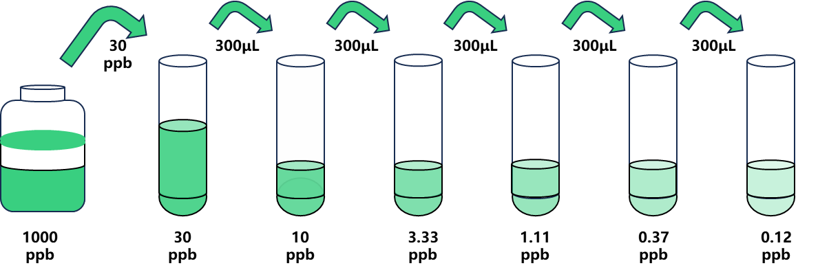 試劑盒中取出標準品,準備7個試管,先將1000 ppb標準品(100µL)按需吸取一定量用1×稀釋液稀釋至30 ppb(例:30µL的標準品母液+970µL的1×稀釋液,制備得到1000μL的30 ppb濃度標準品),隨后在5個試管中分別加入600μL的1×稀釋液,在這5個單獨的試管中將30ppb標準品依次3倍倍比稀釋至5個梯度,共配制6個濃度的標準品,依次為:30 ppb、10 ppb、3.33 ppb、1.11 ppb、0.37 ppb、0.12 ppb,從最高濃度標準品溶液中吸取300μL標準品到下一個試管中,輕輕吹打混勻,以此類推進行標準品的倍比稀釋(如圖所示),1×稀釋液用作零濃度標準品(0ppb)。