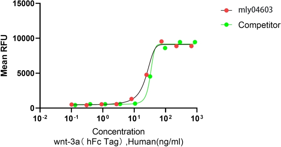 Measured by its ability to induce Topflash reporter activity in CHO cells in the presence of 5ng/ml BMP2. The ED50  for this effect  is   < 30ng/ml. The  activity of Recombinant  Human Wnt-3a(hFc Tag ) (cat  no mly04603) was  higher  than other competing products.